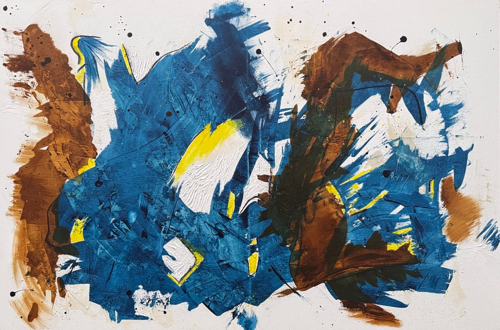 Deep blues intersect with earthy tones and flashes of light, creating a dynamic dialogue between density and flow.